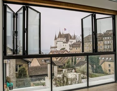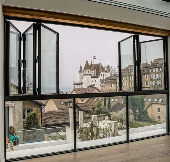 Jendela lipat adalah pilihan yang menarik untuk rumah minimalis karna memberikan fleksibilitas dalam mengontrol ventilasi dan pencahayaan alami. Mereka terdiri dari panel kaca yang terhubung dengan engsel dan dapat dilipat ke dalam atau ke luar ruangan. Jendela lipat menciptakan koneksi yang harmonis antara ruang dalam dan luar, sambil memberikan sentuhan kontemporer pada desain rumah.