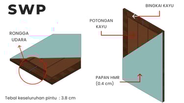 Di sisi lain, Pintu SWP merupakan pintu engineering yang terbuat dari potongan kayu solid yang dilaminasi dengan HMR board (High Moisture Resistance) di kedua sisinya. Pintu ini didesain untuk memberikan kepraktisan tanpa mengorbankan estetika, menjadikannya pilihan modern yang ekonomis dan fungsional.